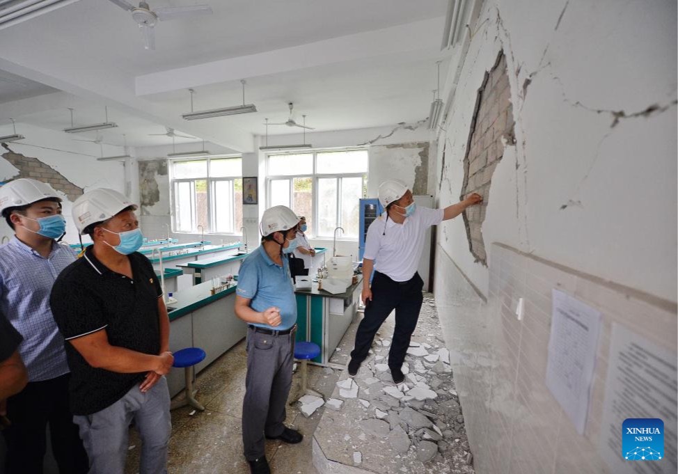 Local government officers learn about the damage caused by the earthquake to a teaching building in Taiping Town of Lushan County, southwest China's Sichuan Province, June 2, 2022.