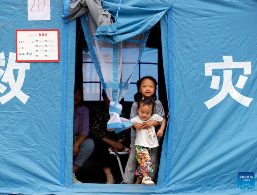 Two children are seen in a tent at a temporary shelter in Dahe Village of Lushan County, southwest China's Sichuan Province, June 2, 2022.