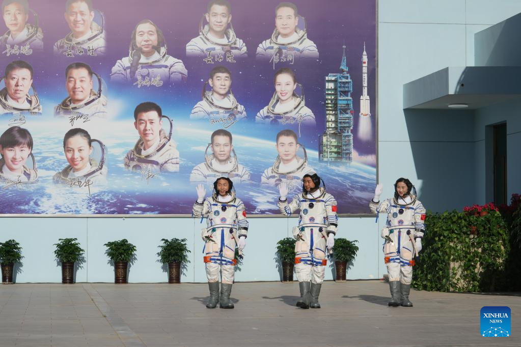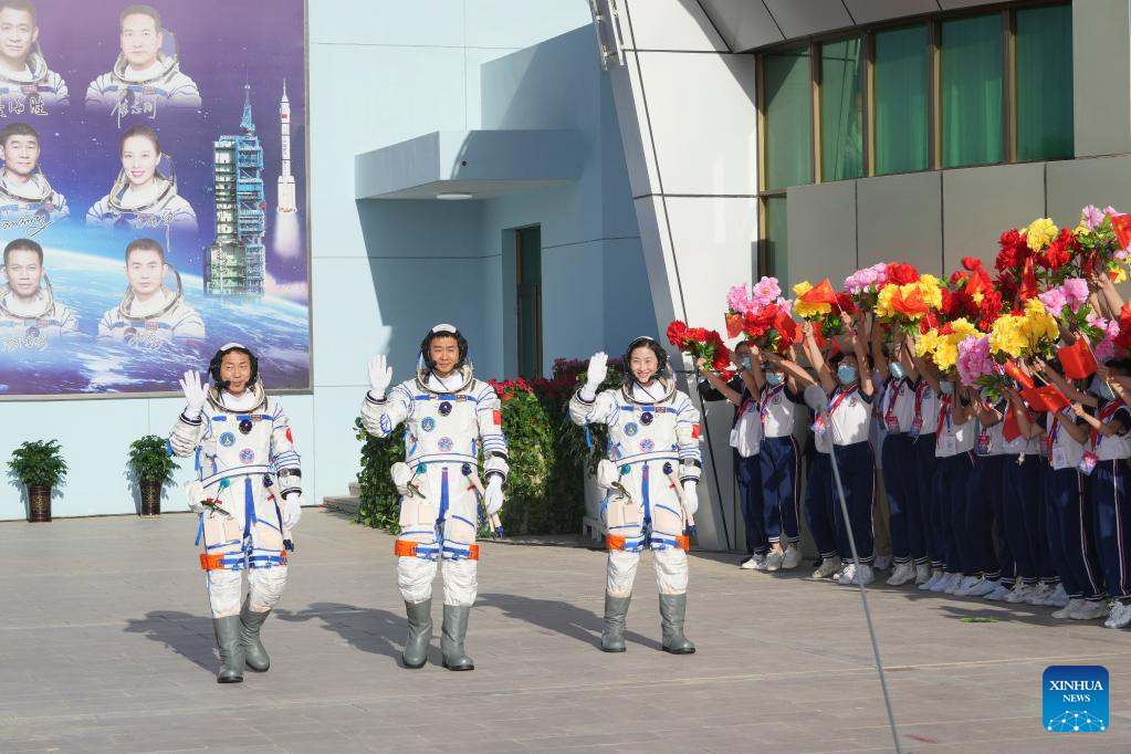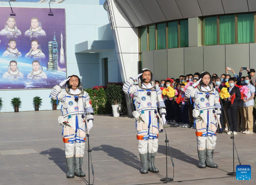 A see-off ceremony for three Chinese astronauts of the Shenzhou-14 crewed space mission is held at the Jiuquan Satellite Launch Center in northwest China, June 5, 2022. Chinese astronauts Chen Dong (C), Liu Yang (R) and Cai Xuzhe will stay in space for about six months. (Xinhua/Cai Yang)