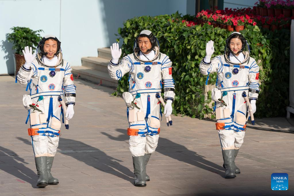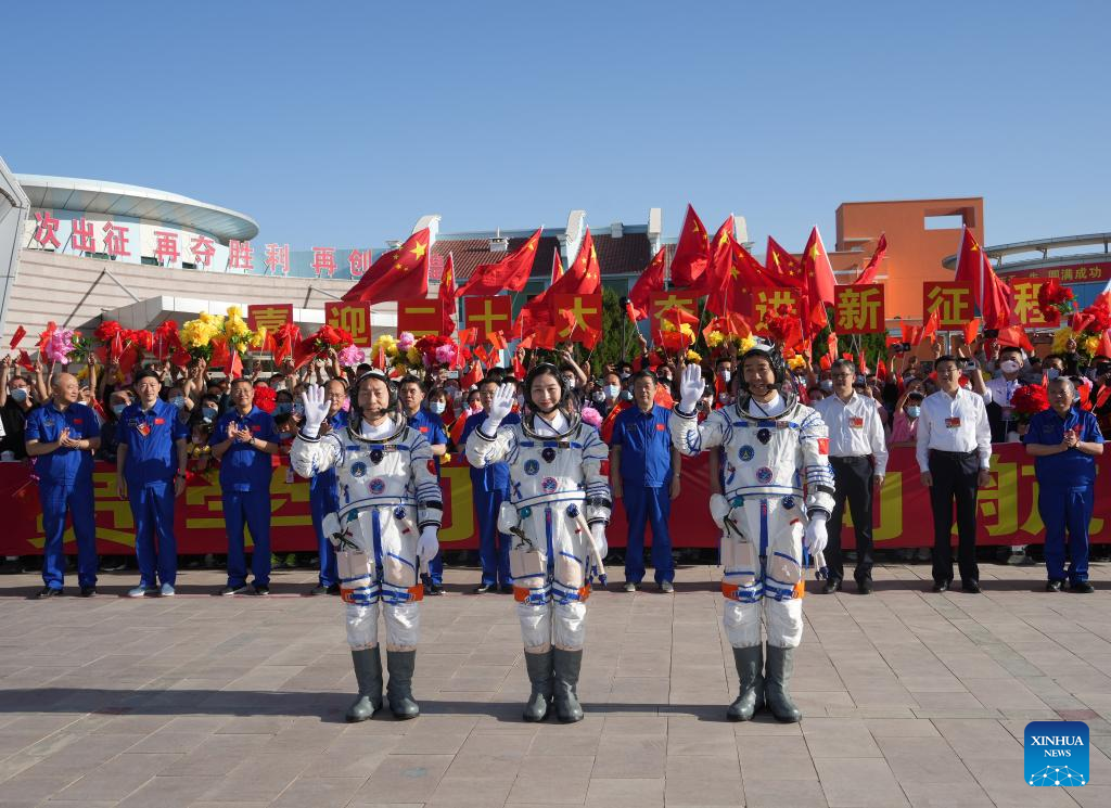 JIUQUAN, June 5 (Xinhua) -- A see-off ceremony for three Chinese astronauts of the Shenzhou-14 crewed space mission was held on Sunday morning at the Jiuquan Satellite Launch Center in northwest China.