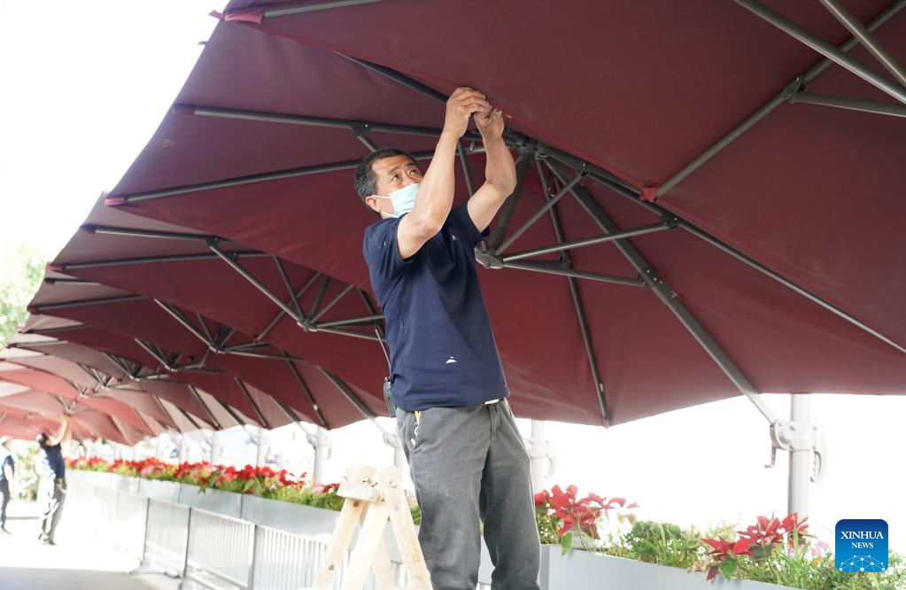 Staff members put up a rainproof shelter at an exam site of the upcoming national college entrance exam for 2022 in Beijing, capital of China, June 5, 2022.