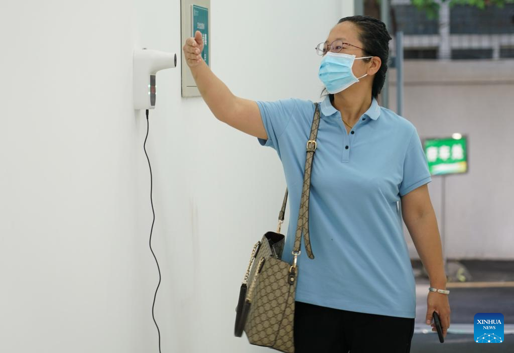 A staff member has her body temperature checked at an exam site of the upcoming national college entrance exam for 2022 in Beijing, capital of China, June 5, 2022.