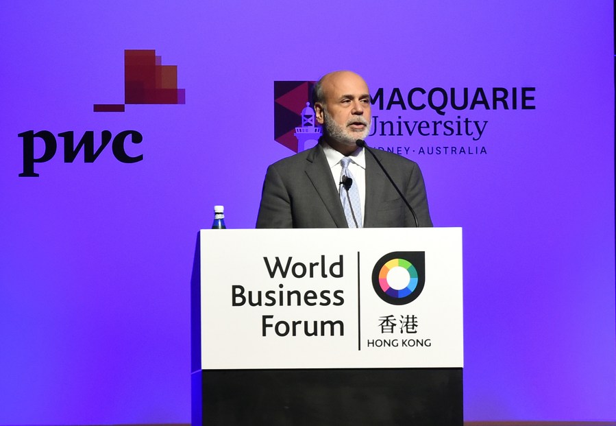 Ben Bernanke, former U.S. Federal Reserve chairman, speaks at the World Business Forum in south China's Hong Kong, June 2, 2015. (Xinhua/Lo Ping Fai)
