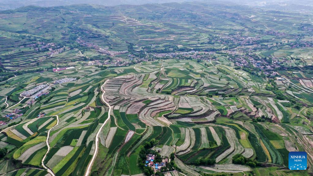 Aerial photo taken on June 6, 2022 shows Majiayuan terrace in Zhangjiachuan Hui Autonomous County in Tianshui, northwest China's Gansu Province. (Xinhua/Chen Bin)