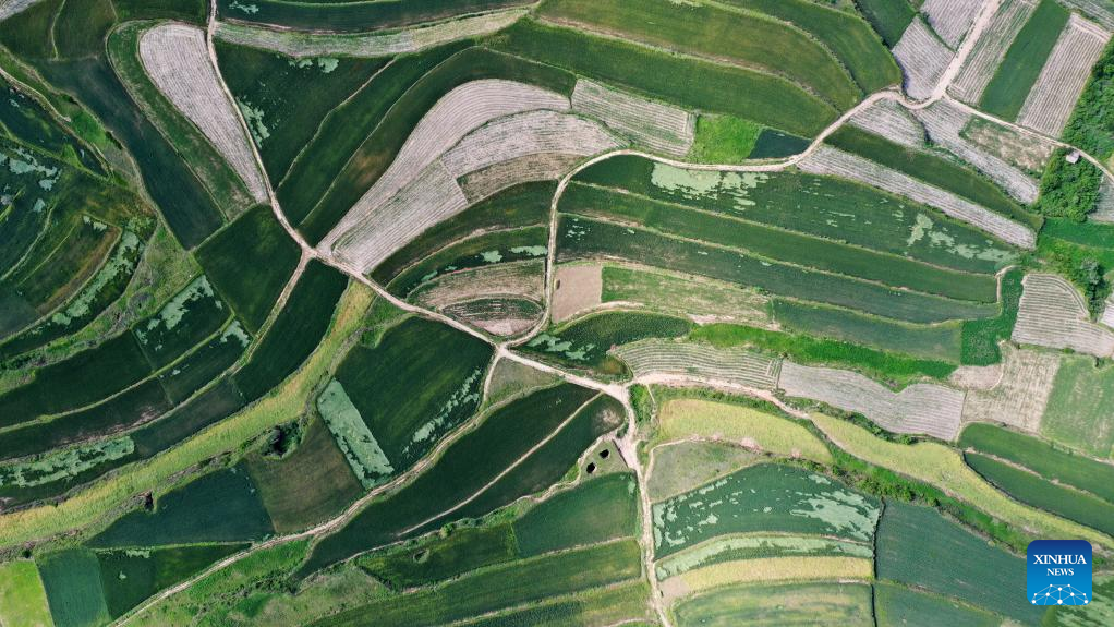 Aerial photo taken on June 6, 2022 shows Majiayuan terrace in Zhangjiachuan Hui Autonomous County in Tianshui, northwest China's Gansu Province. (Xinhua/Chen Bin)