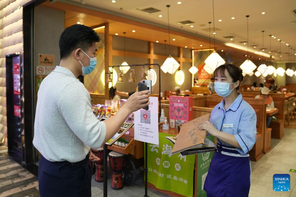 A customer shows his health code to a waitress before entering a restaurant in a shopping mall in Chaoyang District of Beijing, capital of China, June 6, 2022.