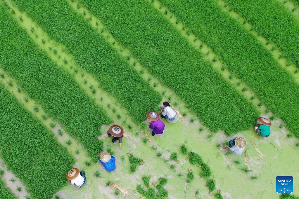 Aerial photo taken on June 5, 2022 shows farmers busy working in the field ahead of the day of "Mangzhong", or "Grain in Ear", in Yixi Village, Dayou Township, Cengong County, Qiandongnan Miao and Dong Autonomous Prefecture, southwest China's Guizhou Province.