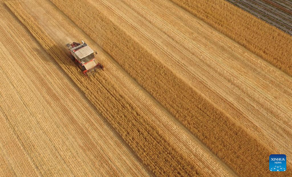 Aerial photo taken on June 5, 2022 shows a harvester reaping wheat in the field ahead of the day of "Mangzhong", or "Grain in Ear", in Bianqiao Township, Pingyi County, Linyi City, east China's Shandong Province.