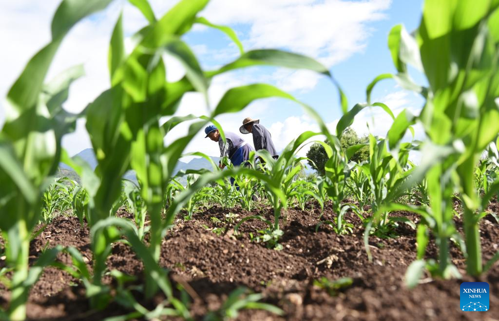 Farmers are busy working in a maize field ahead of the day of "Mangzhong", or "Grain in Ear", in Huangshan Township, Yulong County, Lijiang City, southwest China's Yunnan Province, June 5, 2022.