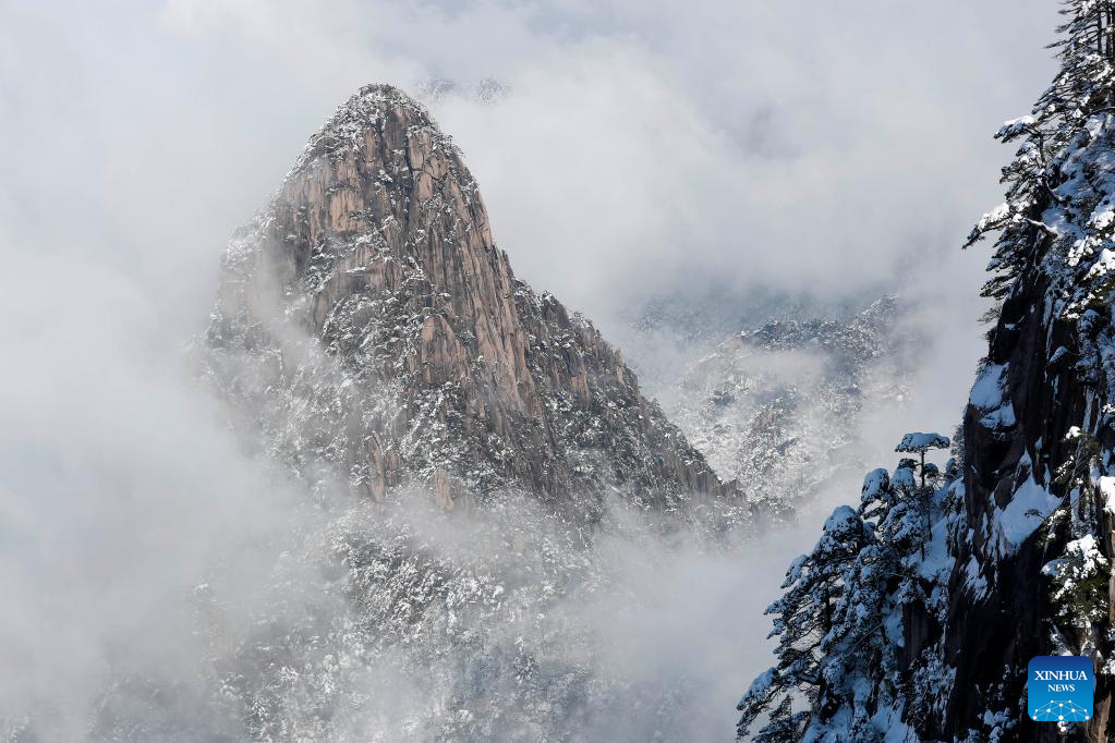 Photo taken on Feb. 5, 2022 shows the snowy scenery of Mount Huangshan.