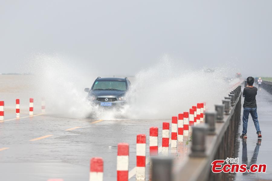 A car runs on the submerged Dahuchi section of Yongwu Road in Jiujiang city, east China's Jiangxi Province, June 6, 2022. (Photo: China News Service/Liu Lixin)