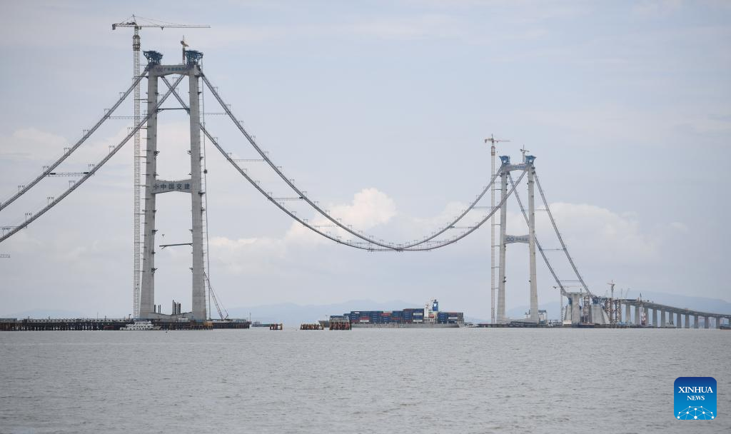 Photo taken on June 7, 2022 shows the Lingdingyang Bridge under construction as part of the Shenzhen-Zhongshan link in south China.