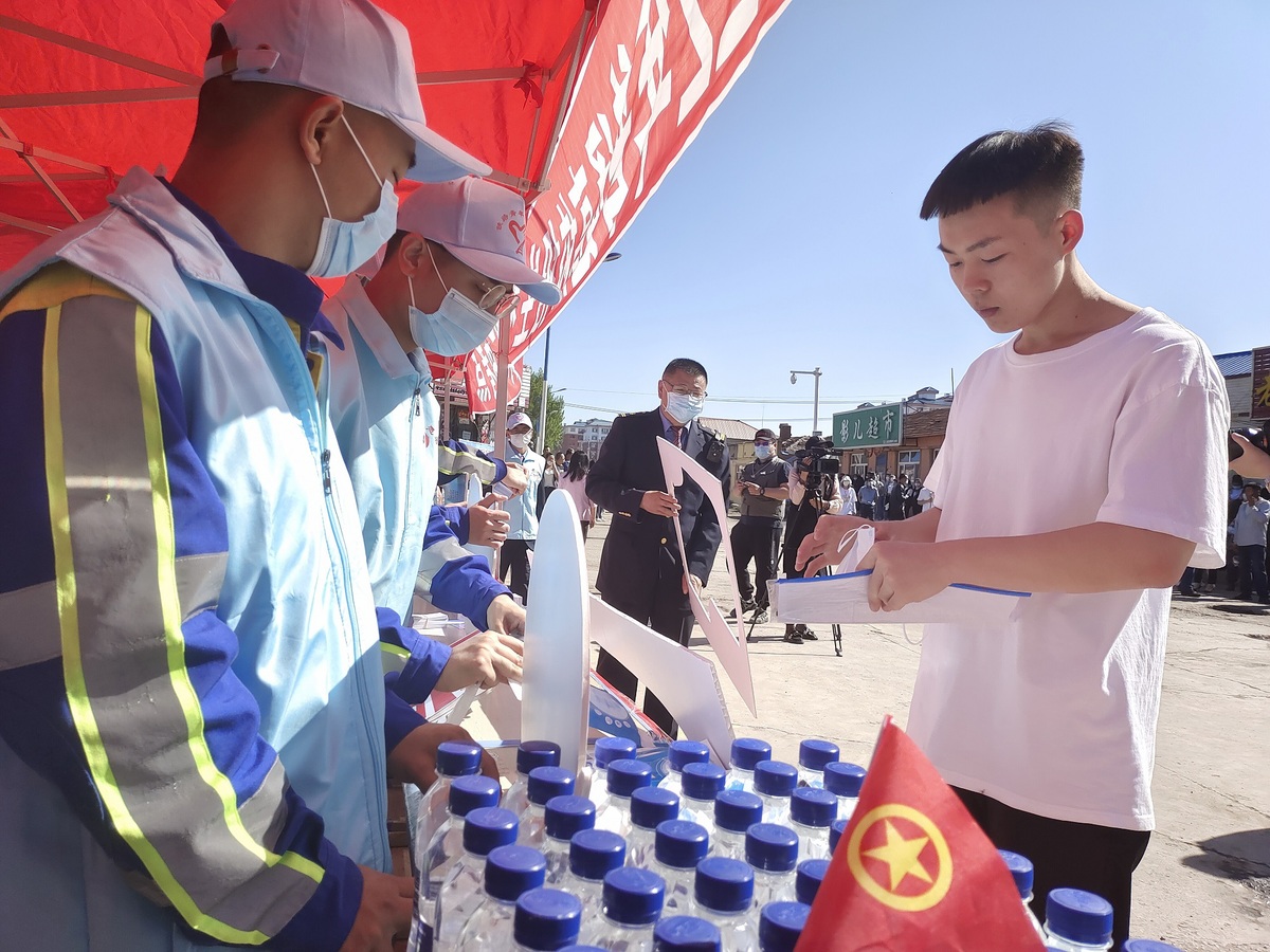 Railway workers at Dayangshu Railway Station prepare bottled water and stationery for students. [Photo by Yuan Yong/For chinadaily.com.cn]