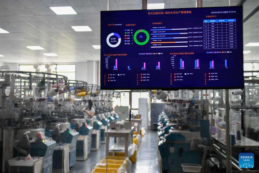 Intelligent manufacturing equipment and digital systems are seen at a sock factory in Zhuji City, east China's Zhejiang Province, on April 21, 2022.(Xinhua/Huang Zongzhi)