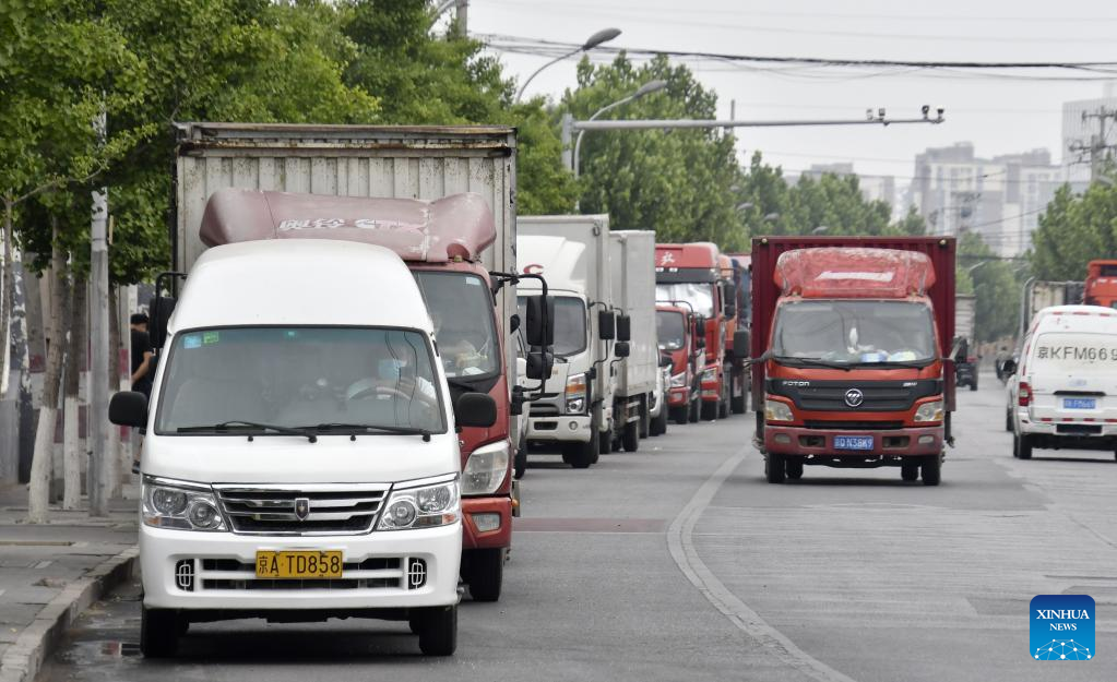 Freight trucks line up to pick up loads in Fengtai District, Beijing, capital of China, June 9, 2022.