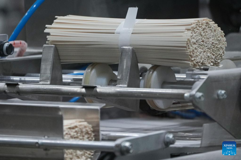 Fine dried noodles are seen on the production line at a wheat processing plant in Woyang County of Bozhou City, east China's Anhui Province, June 7, 2022. (Xinhua/Du Yu)