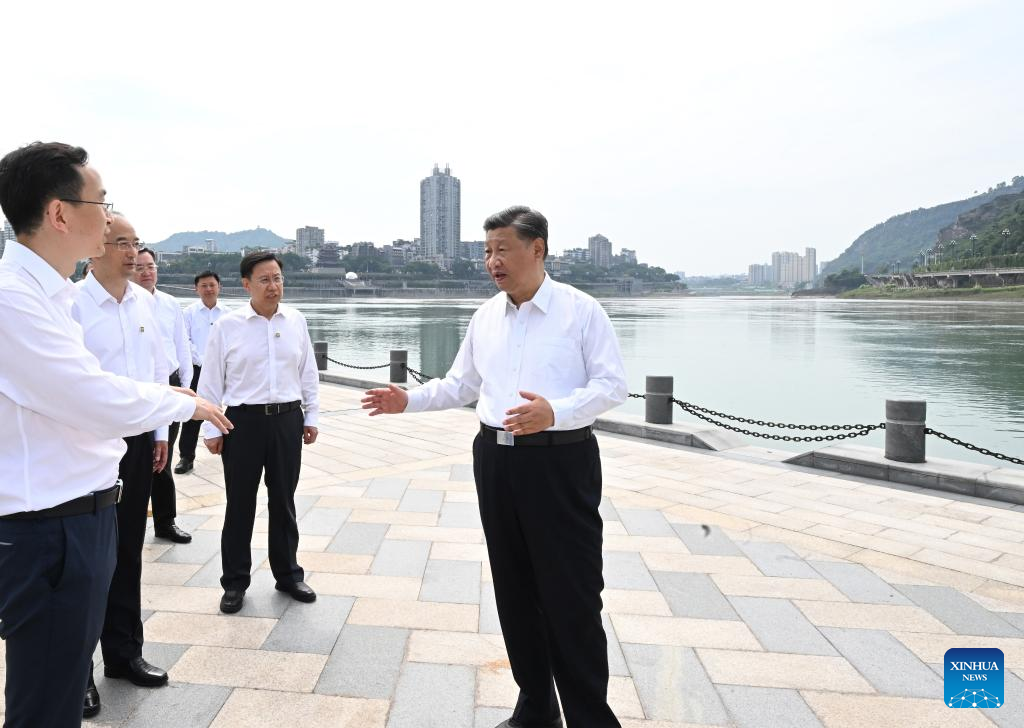 Chinese President Xi Jinping, also general secretary of the Communist Party of China Central Committee and chairman of the Central Military Commission, visits Sanjiangkou, where the Jinsha and Minjiang rivers converge into the Yangtze River, to learn about local efforts in the ecological restoration and protection along the Yangtze River, in Yibin, southwest China's Sichuan Province, June 8, 2022. Xi made an inspection tour of southwest China's Sichuan Province on Wednesday. (Xinhua/Li Xueren)