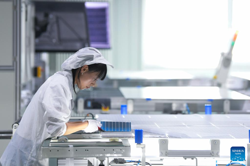 A staff member works at a photovoltaic modules manufacturer in Gonghe County of Hainan Tibetan Autonomous Prefecture, northwest China's Qinghai Province, June 7, 2022.