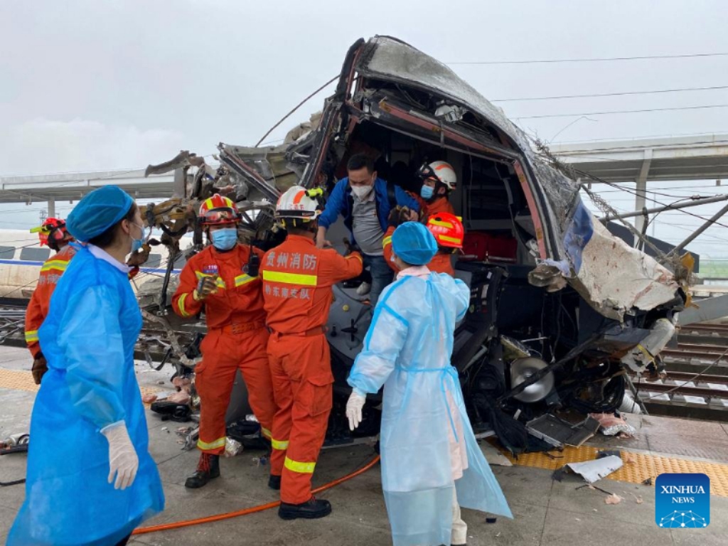 Rescuers evacuate a passenger at the site of the train derail accident in Rongjiang County, southwest China's Guizhou Province, June 4, 2022. (Xinhua)
