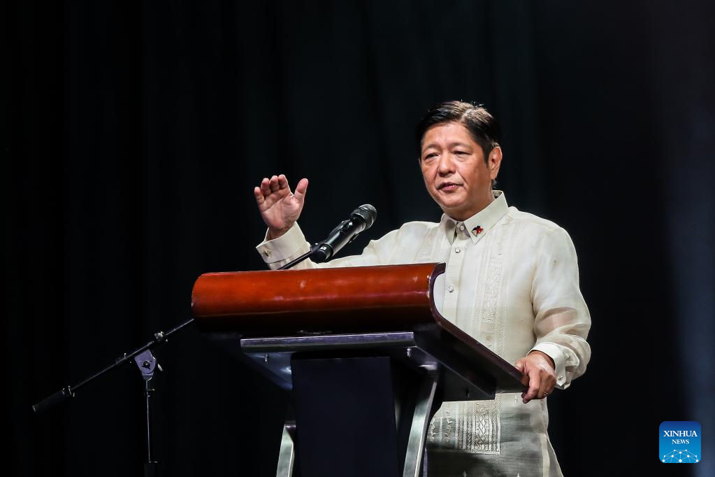 Philippine President-elect Ferdinand Romualdez Marcos delivers a speech during the awarding ceremony to Filipinos that contributed to the promotion of the Philippines-China mutual understanding, in Makati City, the Philippines on June 10, 2022. The newly-elected Philippine leader on Friday vowed to foster stronger and deeper Philippines-China relations during his six-year administration. (Photo by Rouelle Umali/Xinhua)