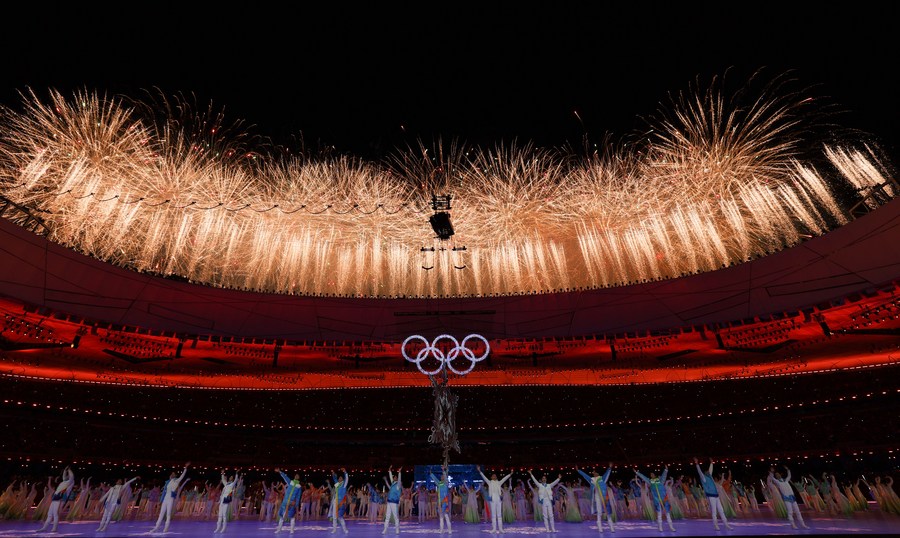 Fireworks illuminate the night sky during the closing ceremony of the Beijing 2022 Olympic Winter Games at the National Stadium in Beijing, capital of China, Feb. 20, 2022. (Xinhua/Cao Can)