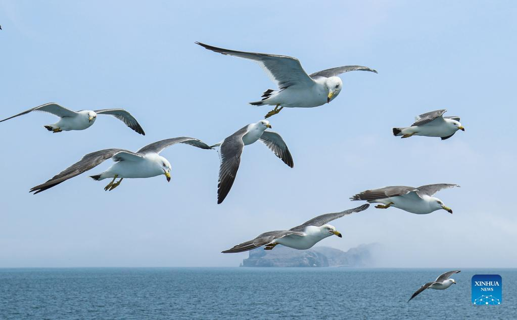 A colony of black-tailed gulls fly over the water in Rongcheng, east China's Shandong Province, June 12, 2022. (Photo by Li Xinjun/Xinhua)