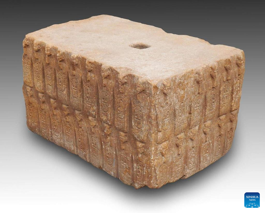 An undated image shows a block carved with patterns unearthed in Ain Shams area, Cairo, Egypt. An Egyptian-German archaeological mission unearthed granite stone blocks dating back to the era of King Khufu (2589 BC-2566 BC) in eastern Cairo, the Egyptian Ministry of Tourism and Antiquities said Monday. The joint mission also found a piece of granite for King Pepi I Meryre with an inscription of Horus falcon, a pedestal of a statue of King Amasis II and several parts of Sphinx-shaped statues. (Egyptian Ministry of Tourism and Antiquities/Handout via Xinhua)