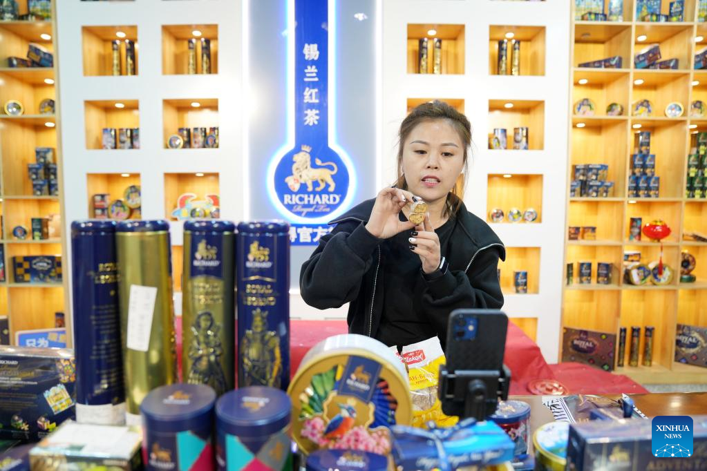 A staff member introduces products on a livestream at Suifenhe Area of China (Heilongjiang) Pilot Free Trade Zone, June 10, 2022. (Xinhua/Wang Jianwei)