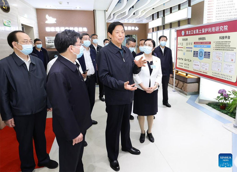 Li Zhanshu, a member of the Standing Committee of the Political Bureau of the Communist Party of China Central Committee and chairman of the National People's Congress Standing Committee, inspects a research institute on chernozem soil conservation in northeast China's Heilongjiang Province, June 12, 2022. Li made a law-enforcement inspection in Heilongjiang Province from June 10 to 13. Led by Li, legislators inspected the province's work in implementing the environmental protection law. They also conducted research for the legislation of a law on chernozem soil conservation. (Xinhua/Pang Xinglei)