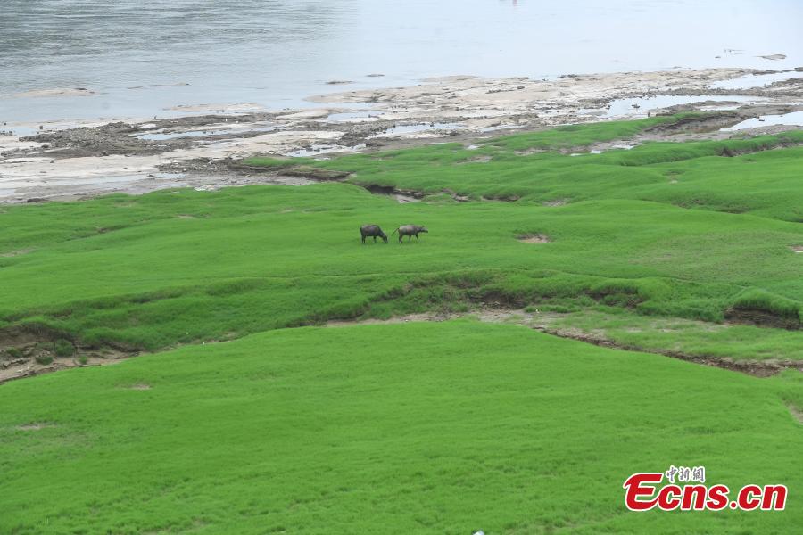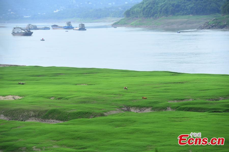 As the water level of the Yangtze River dropped, dense grass has grown in the water-level-fluctuation zone of the Yangtze River in Chongqing.