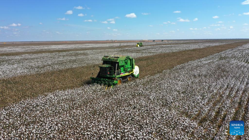 Machines collect cotton at Santa Colomba farm in Bahia state, Brazil, June 14, 2022. Brazil is one of the world's leading cotton producers and exporters. (Photo by Lucio Tavora/Xinhua)