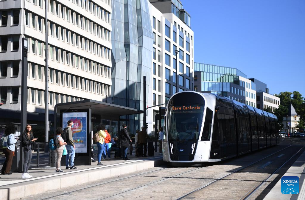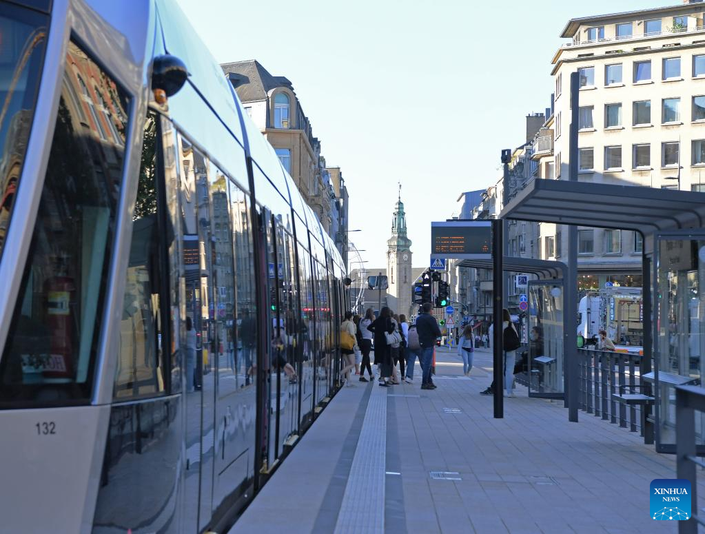 Passengers get off a tram at a tram stop in Luxembourg City, Luxembourg, June 14, 2022. (Xinhua/Ren Pengfei)
