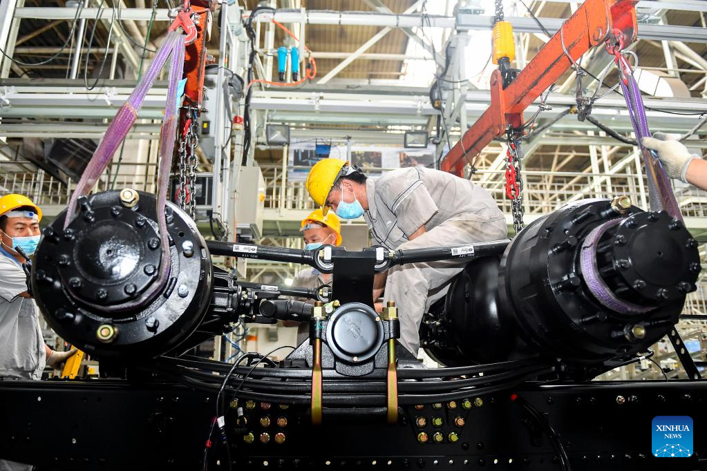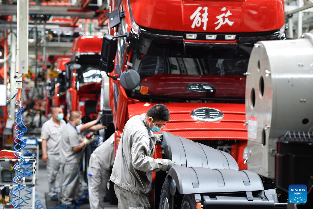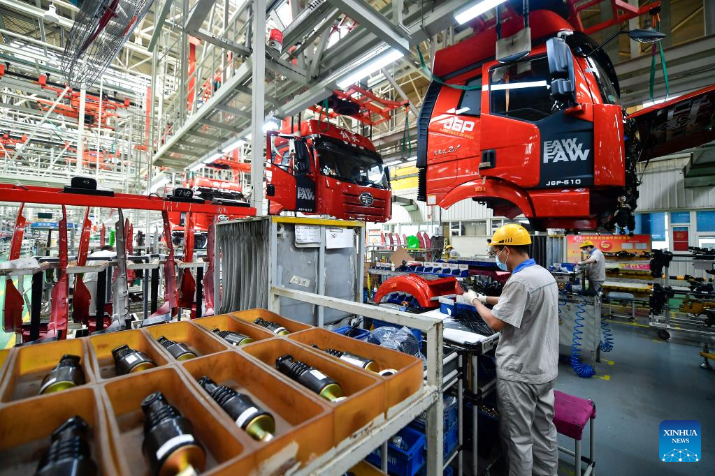 Employees work at an assembly line of FAW Jiefang truck in Changchun, northeast China's Jilin Province, June 15, 2022. (Xinhua/Xu Chang)