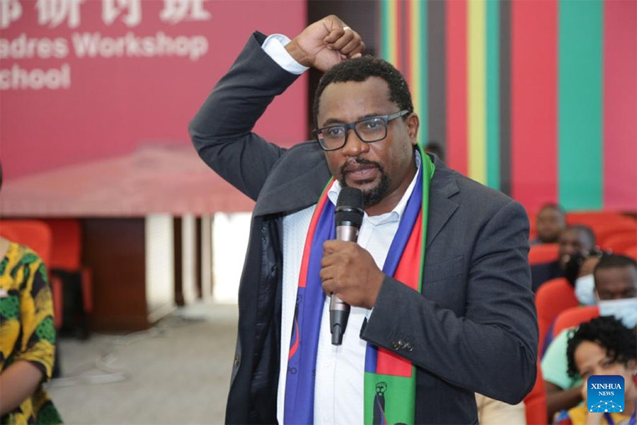 Natangue Ithete, assistant chief whip of the SWAPO Party, speaks during a seminar in Mwalimu Julius Nyerere Leadership School in Coast region, Tanzania on May 28, 2022. (Xinhua)