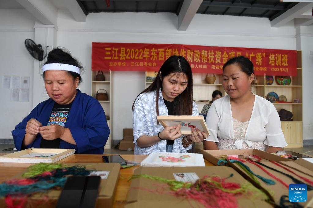 Women learn embroidery at a training class in Guyi Township of Sanjiang Dong Autonomous County, south China's Guangxi Zhuang Autonomous Region, June 16, 2022. Recently local authorities of Sanjiang have organized multiple skill training classes as a way to boost employment and improve locals' incomes. (Xinhua/Lu Boan)