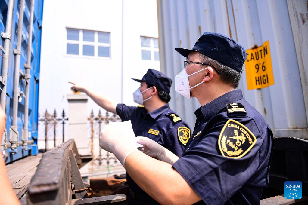 Customs officers inspect containers aboard a China-Europe freight train at the Shenyang East Railway Station in Shenyang, northeast China's Liaoning Province, June 16, 2022.