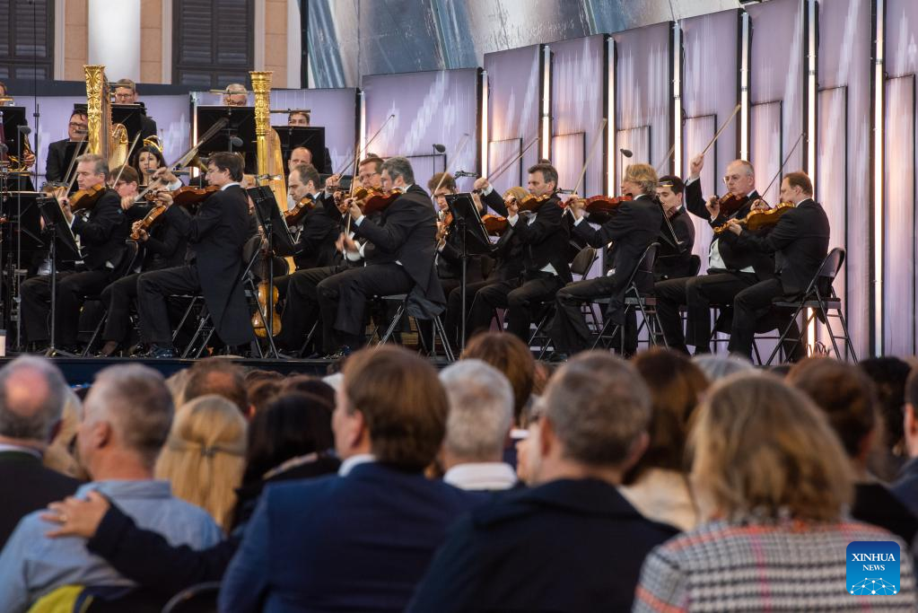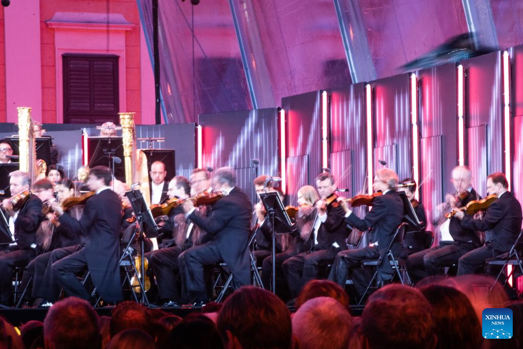 Members of the Vienna Philharmonic perform during the Summer Night Concert at the park of Schoenbrunn Palace in Vienna, Austria, on June 16, 2022. The Summer Night Concert 2022 was staged here by the Vienna Philharmonic on Thursday. (Xinhua/Guo Chen)