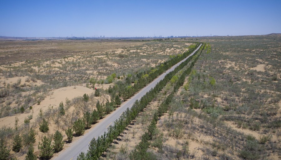 In this aerial photo, sand control workers make straw checkerboard barriers in the Baijitan national ecological reserve of Lingwu, northwest China's Ningxia Hui Autonomous Region, June 16, 2022. (Xinhua/Yang Zhisen)
