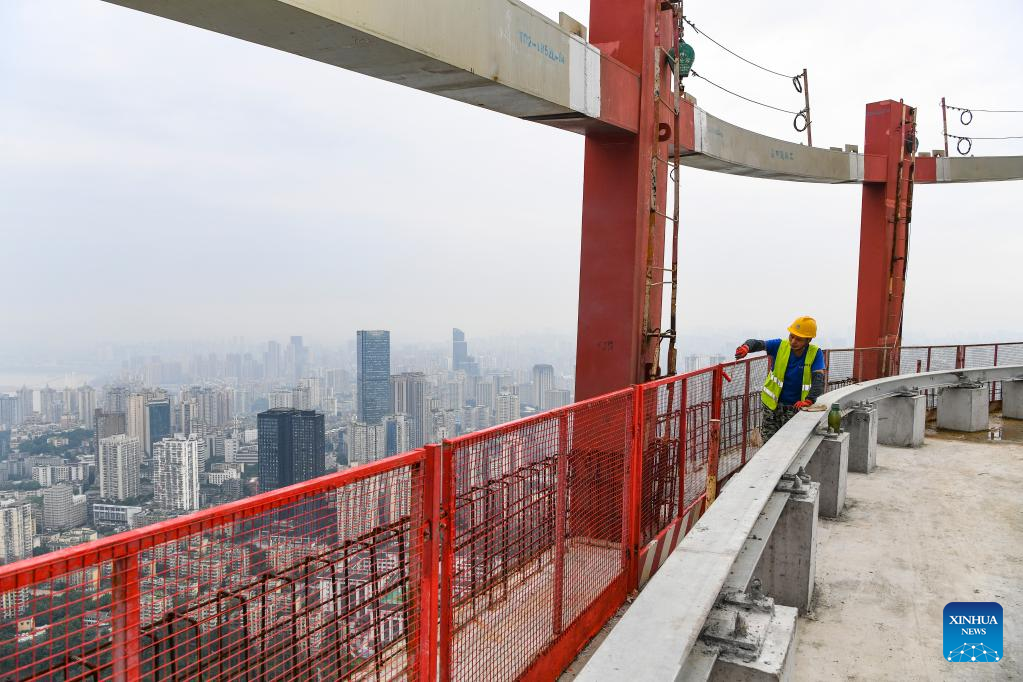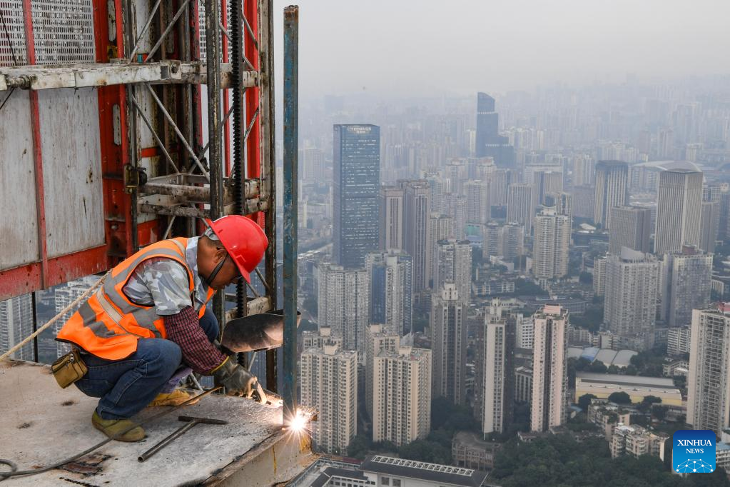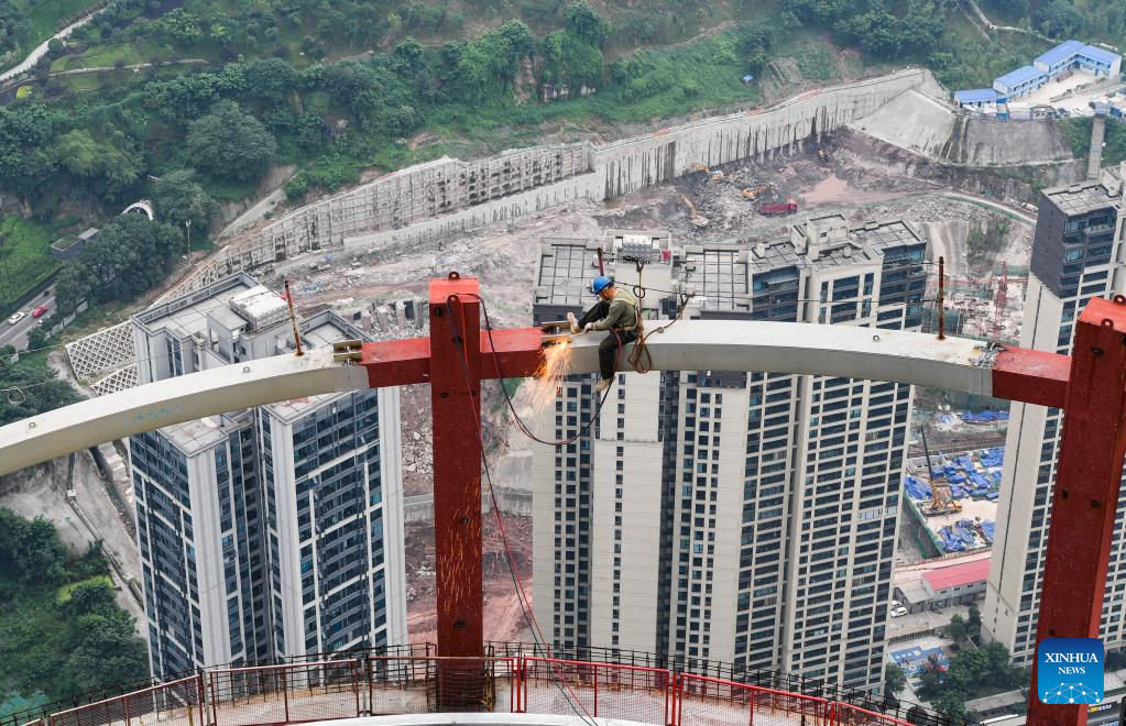 A man works on the main tower of the international land-sea center, also known as Chongqing 100, in southwest China's Chongqing Municipality, June 17, 2022. The 458-meter-high main tower of the international land-sea center, a new skyscraper in Chongqing, was topped out on June 18. (Xinhua/Wang Quanchao)