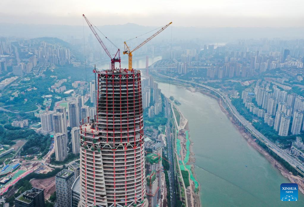 Aerial photo taken on June 17, 2022 shows the main tower of the international land-sea center, also known as Chongqing 100, under construction in southwest China's Chongqing Municipality. The 458-meter-high main tower of the international land-sea center, a new skyscraper in Chongqing, was topped out on June 18. (Xinhua/Wang Quanchao)