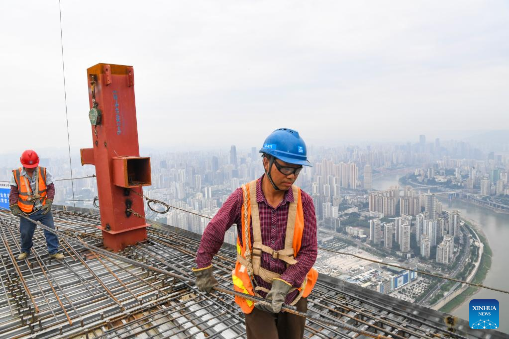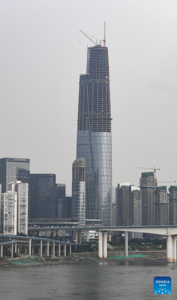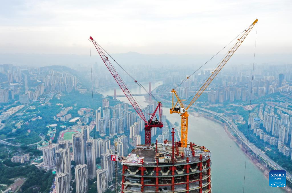 People work on the main tower of the international land-sea center, also known as Chongqing 100, in southwest China's Chongqing Municipality, June 17, 2022. The 458-meter-high main tower of the international land-sea center, a new skyscraper in Chongqing, was topped out on June 18. (Xinhua/Wang Quanchao)