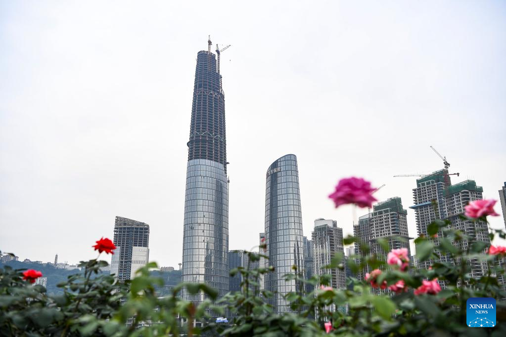 Photo taken on June 17, 2022 shows the international land-sea center in southwest China's Chongqing Municipality. The 458-meter-high main tower of the international land-sea center, a new skyscraper in Chongqing, was topped out on June 18. (Xinhua/Wang Quanchao)