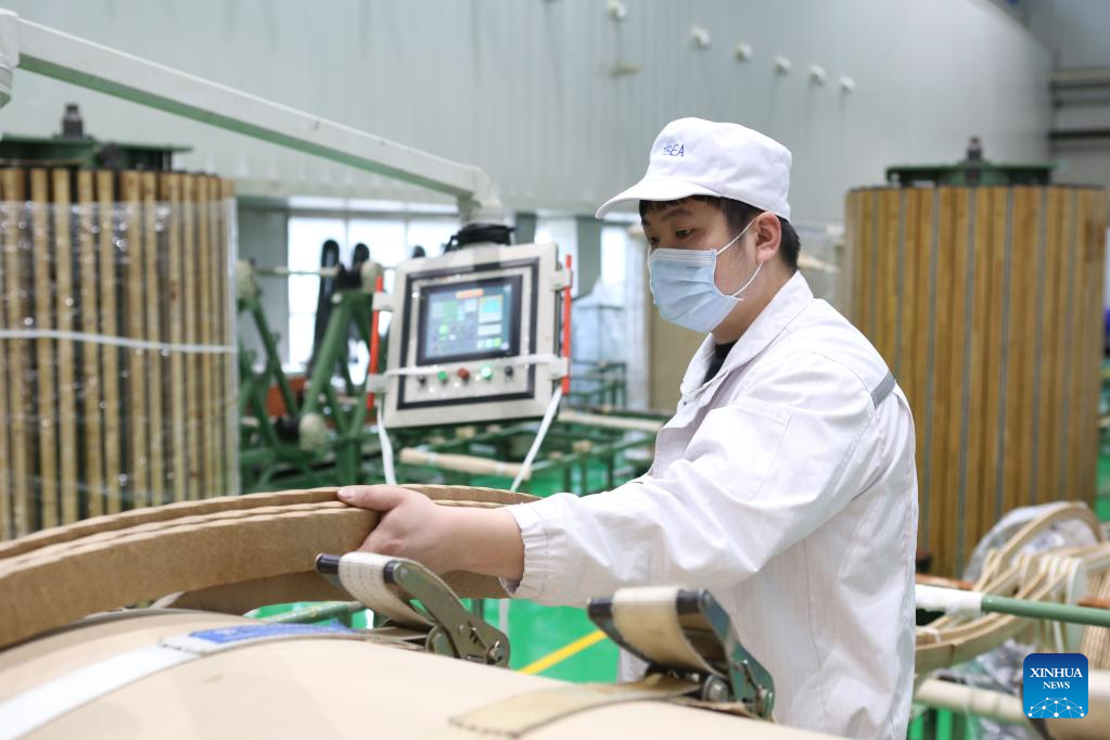 Staff members of TBEA Co., Ltd. make products for the ultrahigh voltage direct current power transmission (UHVDC) projects in Shenyang, northeast China's Liaoning Province, March 27, 2022.