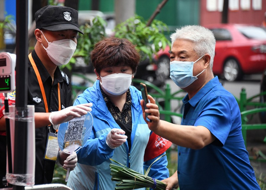 A resident scans a QR code to register his health status at the entrance of a community in Haidian district, Beijing, June 12, 2022. [Photo/Xinhua]