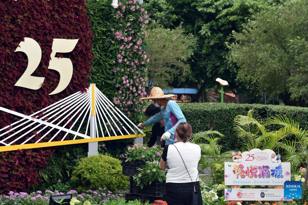 A staff member arranges flowers at a park in Hong Kong, south China, June 20, 2022.