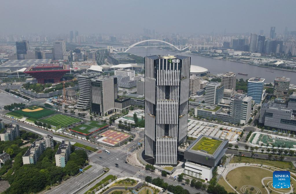 Aerial photo taken on June 17, 2022 shows the headquarters building of the New Development Bank (NDB), also known as the BRICS bank, in east China's Shanghai. (Xinhua/Fang Zhe)