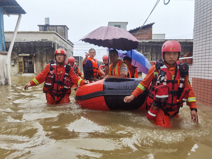 Rescuers evacuate stranded people in flood water in Shaoguan, south China's Guangdong Province, June 21, 2022. (Xinhua/Zhou Sitao)