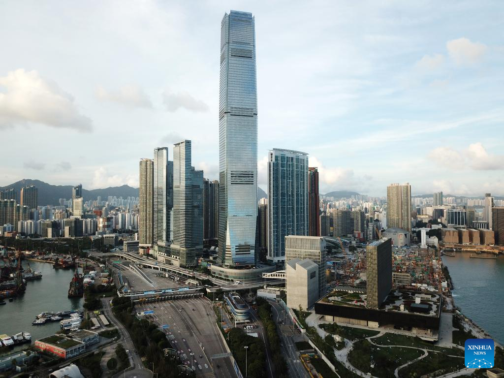 Aerial photo taken on May 31, 2022 shows the Two International Finance Centre (IFC) (top L) and the International Commerce Centre (ICC) (R) in south China's Hong Kong. This year marks the 25th anniversary of Hong Kong's return to the motherland. (Xinhua/Li Gang)