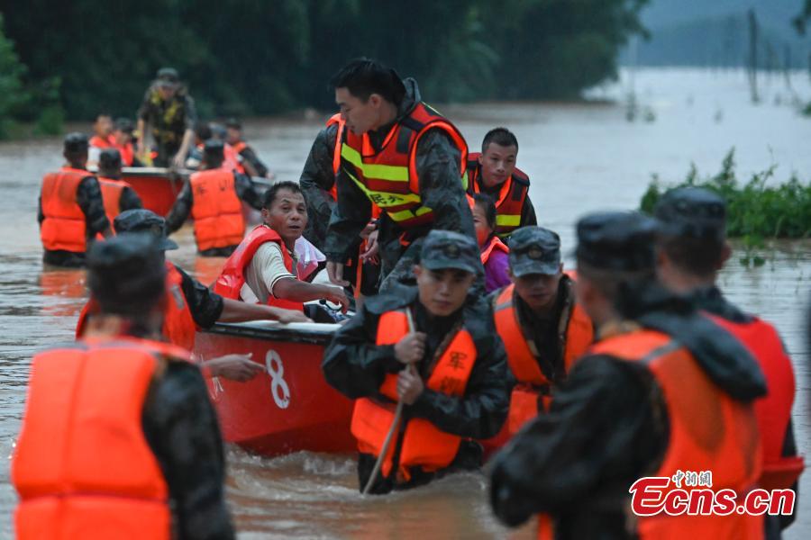 Rescue personnel evacuate trapped people during a major flood in Shaoguan, south China's Guangdong Province, June 21, 2022. (Photo: China News Service/Chen Jimin)