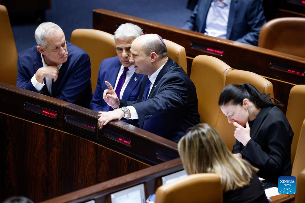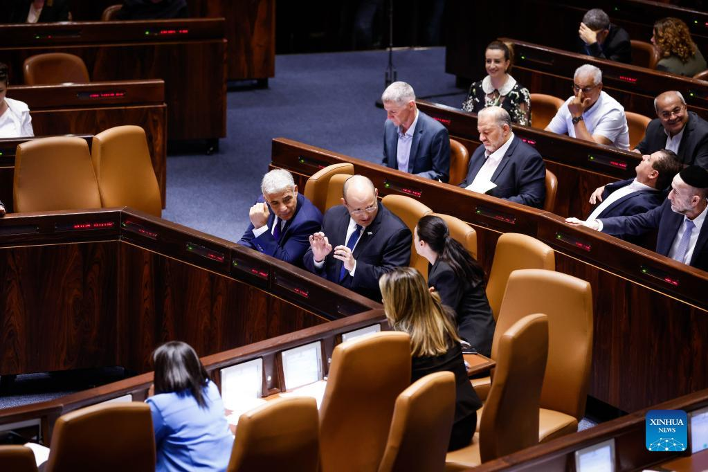 A vote on a bill to dissolve the parliament is held at the assembly hall of the Knesset in Jerusalem, June 22, 2022. Israeli lawmakers voted in favor of a bill to dissolve parliament in a preliminary vote on Wednesday, taking the first step in sending the country for its fifth elections in three years. (JINI via Xinhua)